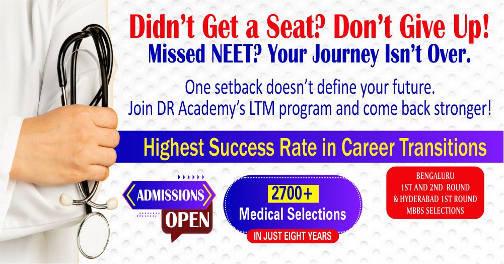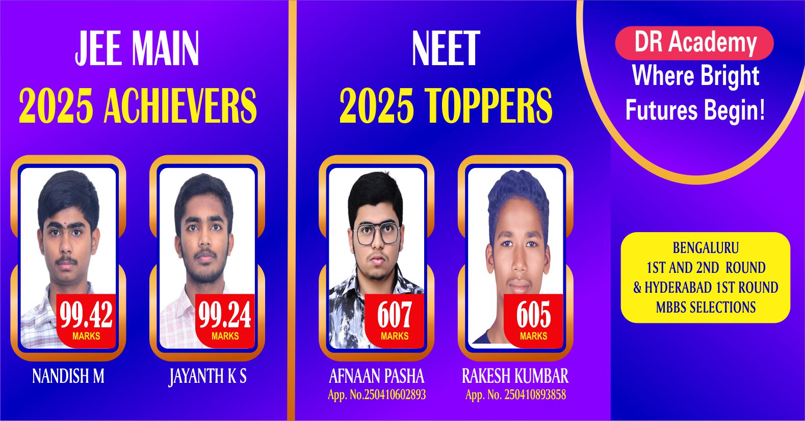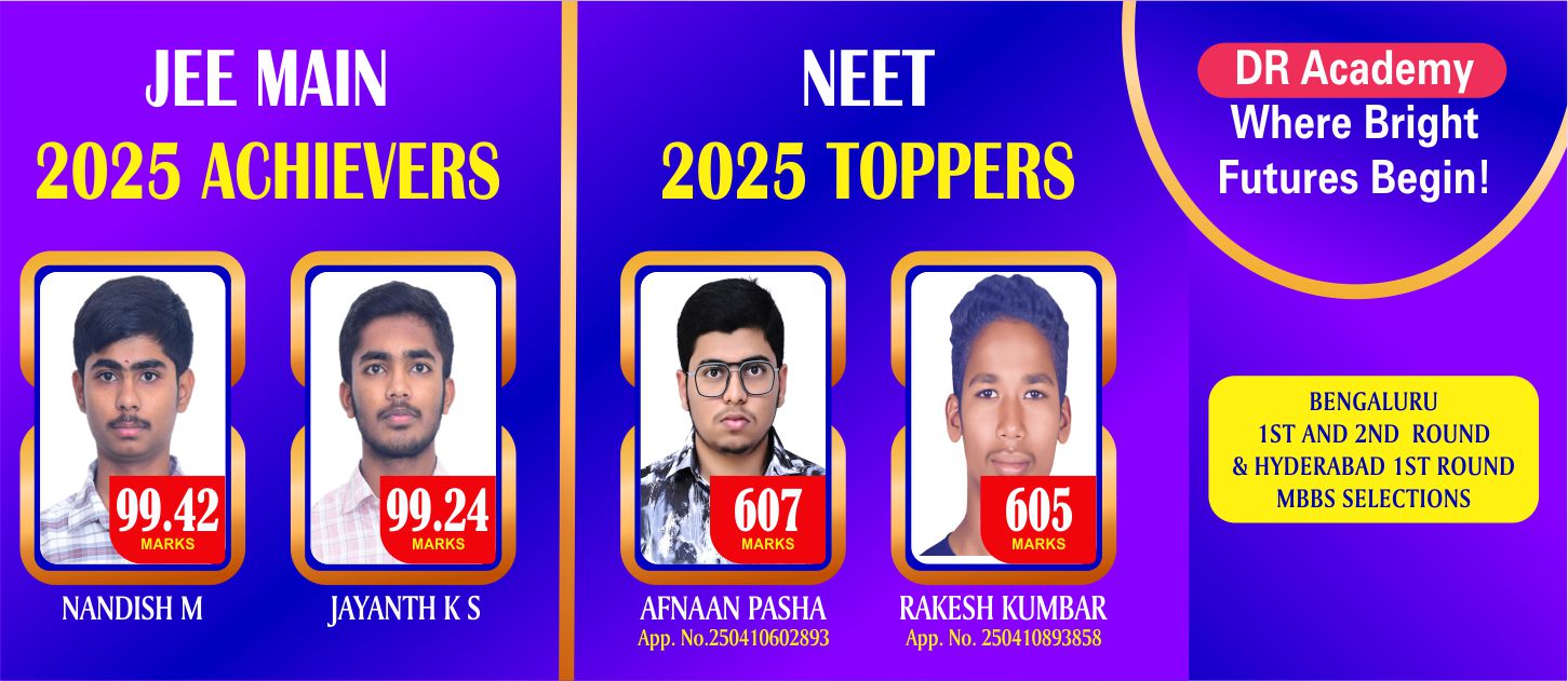 DR Academy is one of the reputed coaching institutions in Karnataka, this Academy started its journey with the intention to impart education to young minds and prepare and design them to face all the competitive exams with courage. The programs and study material for CET, NEET, JEE MAINS is compiled by our experts to enrich students reach successfully towards their goals with pride throughout their lives.